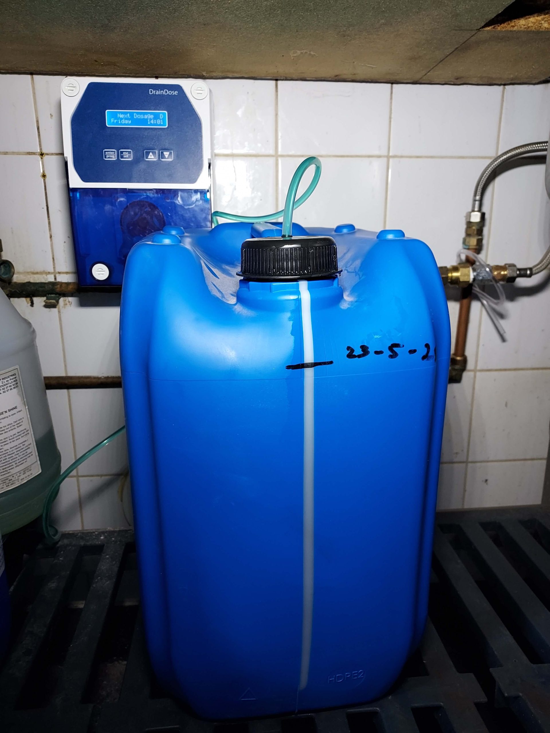 Greasy werkt met een volautomatisch doseersysteem dat natuurlijke bacteriën toevoegt aan de afvoerleiding van de vetafscheider. Elke nacht brengt de pomp een precieze hoeveelheid Greasy-oplossing in het systeem. Deze bacteriën breken vet af tot water en koolstofdioxide, waardoor leidingen en vetput schoon blijven.